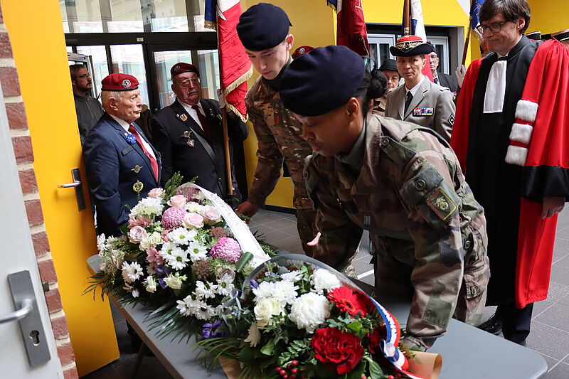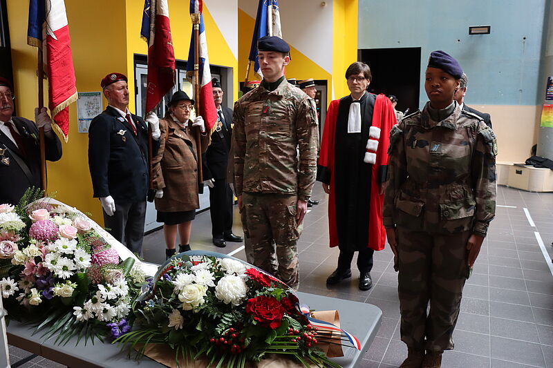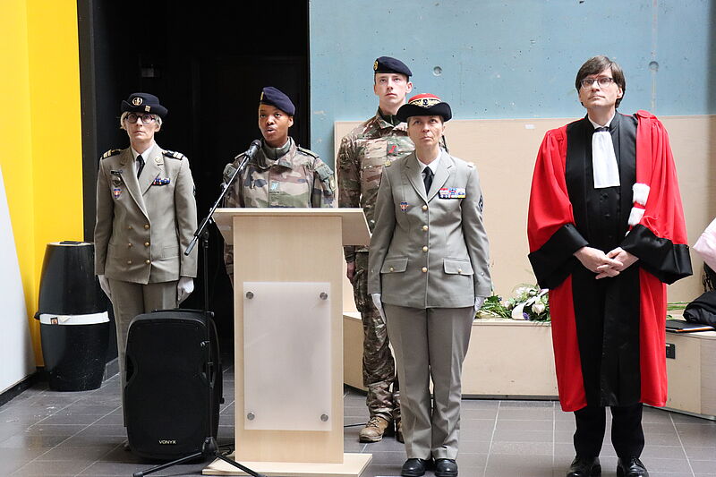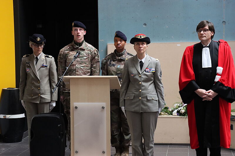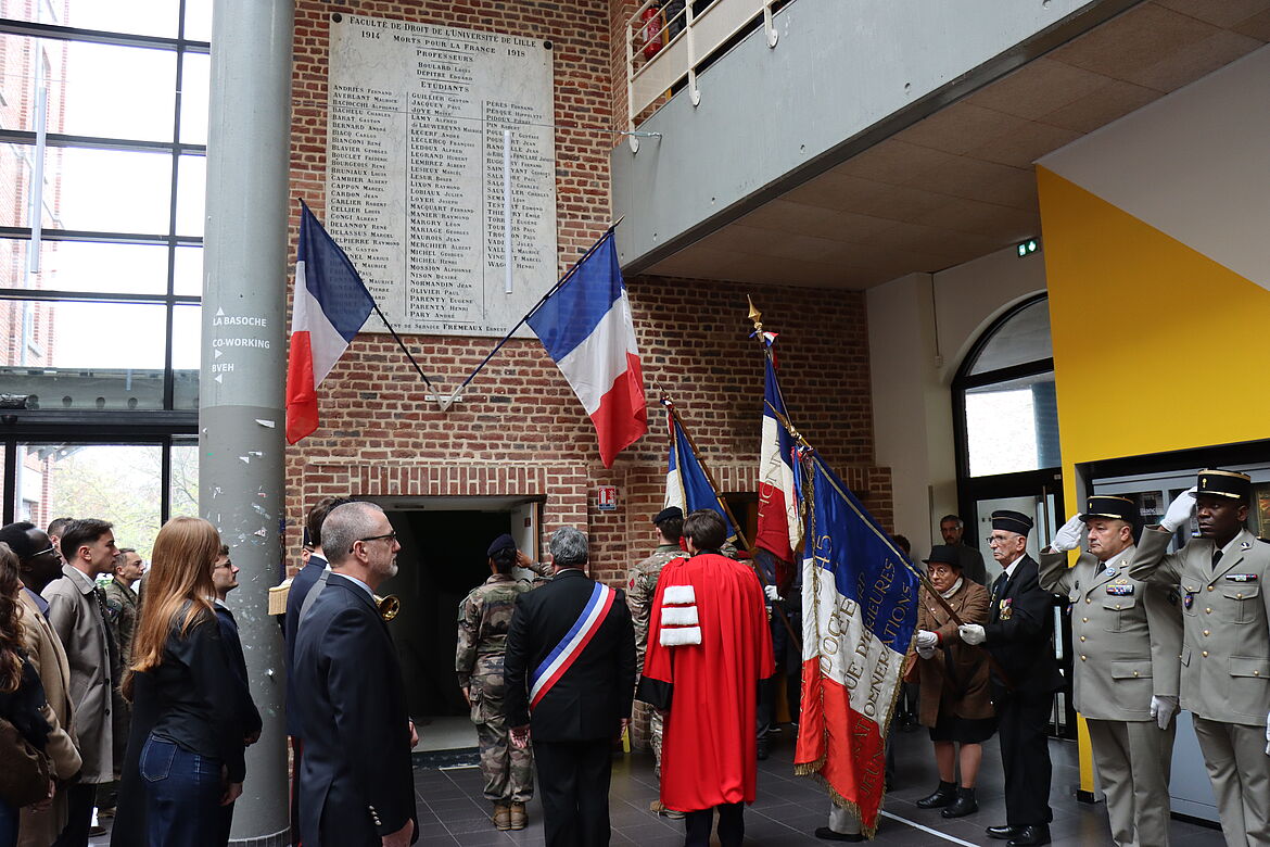 Le lundi 10 novembre 2025 à 15h s'est tenue une cérémonie de commémoration de l'armistice de la Grande Guerre à la FSJPS en présence du Général de division Anne-Cécile ORTEMANN, du Professeur Aymeric POTTEAU, Doyen de la Faculté des sciences juridiques, politiques et sociales, de la Professeure Céline LEBORGNEINGELAERE, Vice-doyenne de la FSJPS, ainsi que de l’association étudiante KRISIS de la FSJPS.