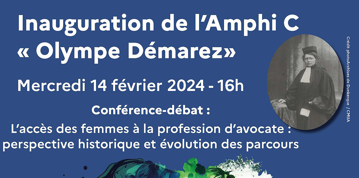 L'Amphi C Olympe Démarez (1878-1964), première femme diplômée de la Faculté de droit de Lille, première avocate du département du Nord sera inauguré le mercredi 14 février à 16h.
