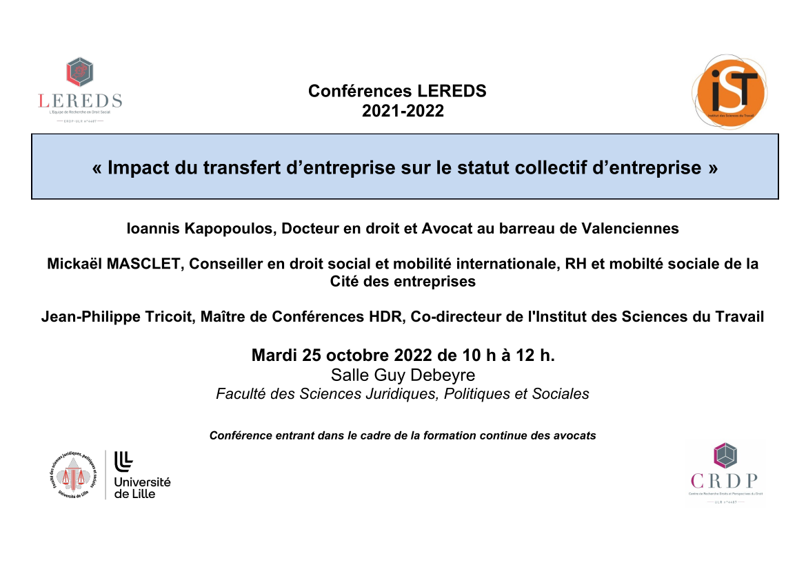 L’Equipe de Recherches en Droit Social (L’EREDS-CRDP) organise, en collaboration avec l’Institut des sciences du travail (IST), une conférence ayant pour objet « L’impact du transfert d’entreprise sur le statut collectif d’entreprise »